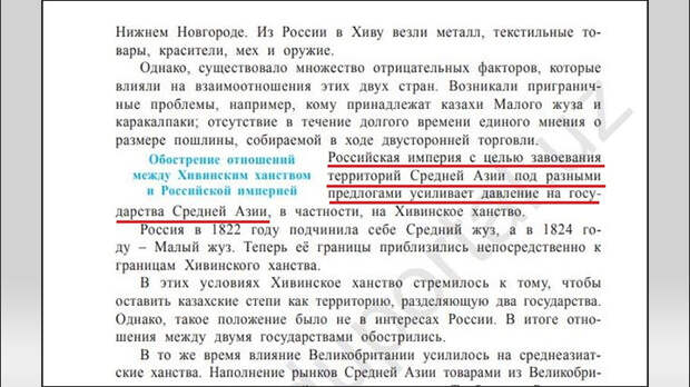 Ситуация с Хивинским и Кокандским ханствами описывается в таких же выражениях: "начало завоевательного похода России против среднеазиатских ханств…", "завоевание Средней Азии под разными предлогами…".