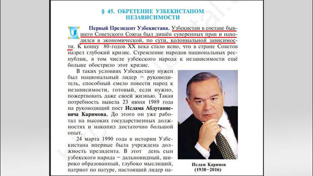 Но новым поколениям граждан страны эти "нюансы" знать ни к чему. Поэтому в учебнике "История Узбекистана" для 10-го класса (2022 г.) о провозглашении независимости в 1991 году говорится: