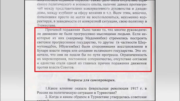 Впрочем, подобное изложение истории началось не при нынешнем руководителе Узбекистана. Достаточно почитать учебник по истории для студентов вузов (см. скриншот выше), изданный в 2011 году, чтобы понять: Россию до 1917 года авторы считают "царским колониальным режимом", а движение басмачей рассматривают как "освободительное движение".