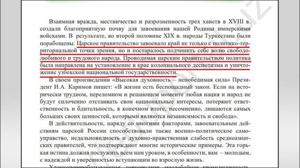 Изданные в 2020 году "Рассказы по истории" (учебник для 5-го класса) внушают юным ученикам, что под властью Москвы население Узбекистана было лишено всех прав и находилось в "колониальной зависимости".