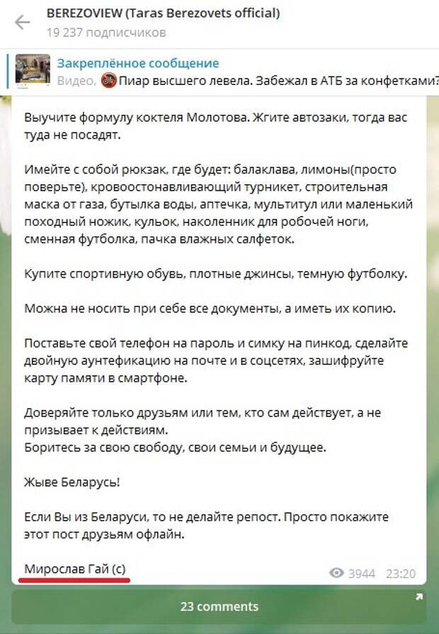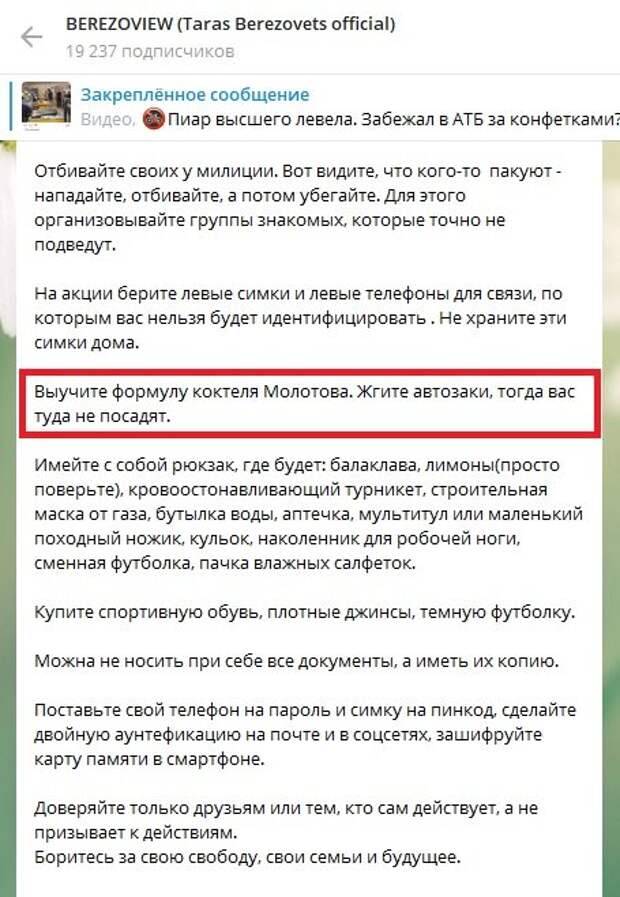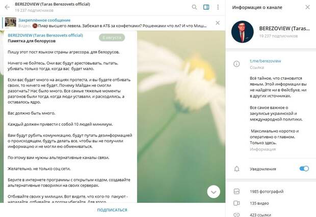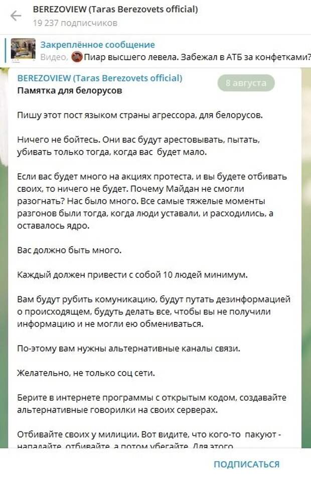 С персоналиями разобрались. Переходим к сути. Вчера, поздно вечером, накануне запланированного в Белоруссии Майдана (запланирован на вечер сегодняшнего дня сразу после окончания финального дня голосования на выборах) политтехнолог Тарас Березовец опубликовал на своем официальном канале в Телеграме призыв к белорусам жестко майданить и жечь автозаки.