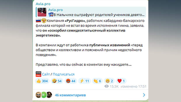 КОМПАНИЯ "РУСГИДРО" ЖДЁТ ПУБЛИЧНЫХ ИЗВИНЕНИЙ ОТ СВОЕГО СОТРУДНИКА, НО РЕЧЬ ОБ УВОЛЬНЕНИИ ПОКА НЕ ИДЁТ. СКРИН С ТГ-КАНАЛА AVIA.PRO