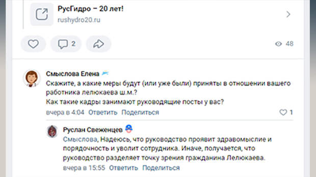 КОЛЛЕГИ ОСКАНДАЛИВШЕГОСЯ СОТРУДНИКА "РУСГИДРО" ТРЕБУЮТ ЕГО УВОЛИТЬ. СКРИН С ВК "РУСГИДРО"
