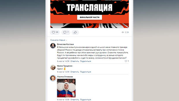 В соцсетях есть страничка, которую ведёт супруга бизнесмена: лайкает посты сообщества "Мы родом из СССР". Среди её публикаций есть и патриотическое стихотворение о русских, которые не подчинились ни одному врагу. И вдруг — история с гимном.