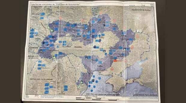На карте, датированной 16 апреля 2025 года, подробно обозначено размещение иностранных войск на территории Украины. Ответственным за проект указан генерал Тьерри Буркхардт, бывший начальник Главного штаба ВС Франции.